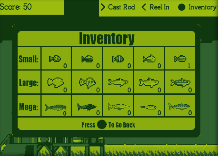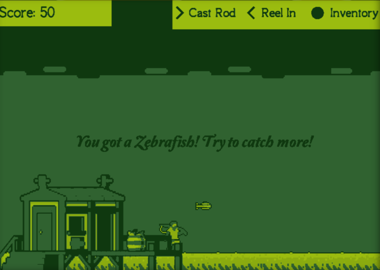 This game is a very basic fishing simulator. You cast your rod using the right arrow key, but must wait for a fish to bite the line. Pressing the left arrow key at the right time puts the fish in your inventory, but if you are too early or late you will have to try again. You can press the space bar at any time to check how many of each fish you have caught. The goal is to catch as many different types of fish, fill up your inventory, and raise your score. All coding and implementation was done by me using Unity. If you would like to play the game, it is available on my itch.io page here: https://piercerustom.itch.io/simple-2d-fishing-simulator