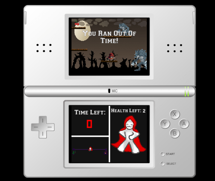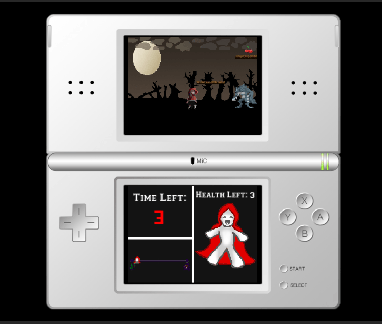 In a modern rendition of a classic story, Red Riding Hood is tasked with bringing goods to her sick grandmother. In this 2D platformer, you have to make your way to the end while avoiding dangerous animals without taking too much damage or having the timer run out. You can also collect fruit along the way to make sure you can make it in time! Being designed for the Nintendo DS dual screen layout, gameplay is shown up top while the bottom half displays character health, remaining time, and a mini map to show where you are from the start to the end. All coding and implementation was done by me. If you would like to play, it is available on my itch.io page here: https://piercerustom.itch.io/little-red-riding-hood-platformer